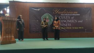 Proses Yudisium dilanjutkan dengan pembacaan SK Yudisium oleh Anna Sofia Atichasari, SE., M.Ak., CMA., diikuti oleh segenap pengurus harian FEB, termasuk Dr. Masruri, Drs., MM., serta Kaprodi Bisnis Digital, Sugeng Lubar Prastowo, ST., MM., Kaprodi Akuntansi, Rida Ristiyana, SE., M.Ak., dan penjamin mutu, Dr. Sutarjo, SE., MM. Tak ketinggalan, Kepala Laboratorium Akuntansi, Yosi Yetmi, SE., M.Si., juga turut memberikan kontribusi dalam acara ini.